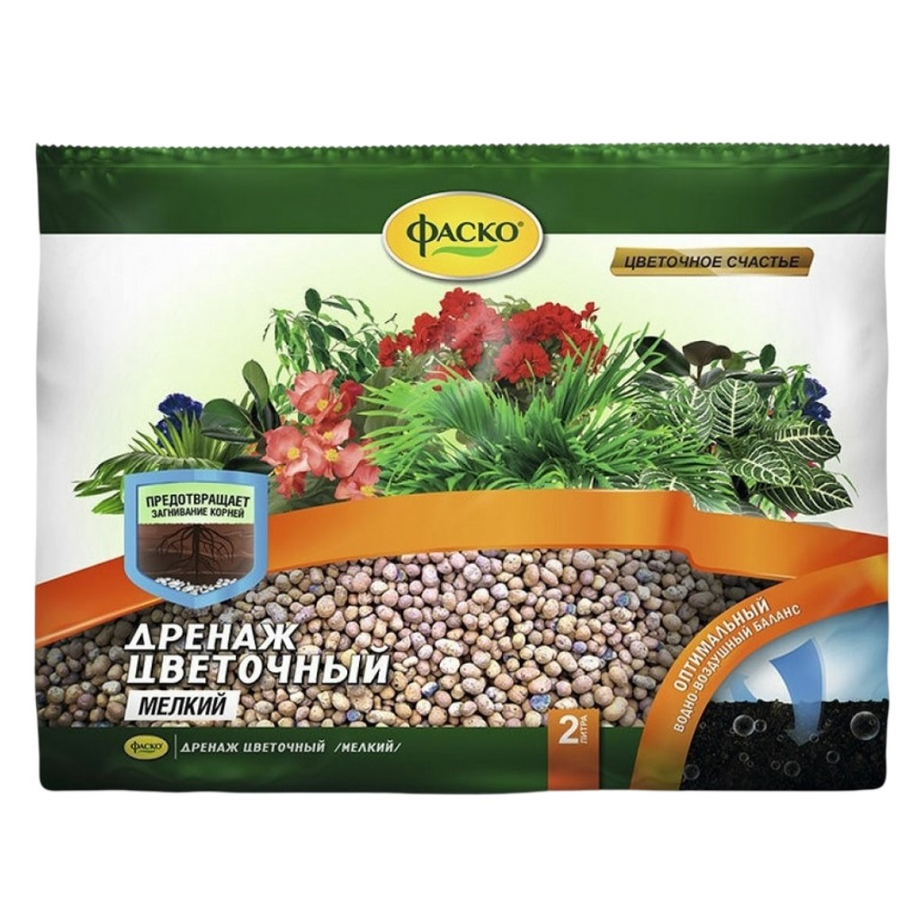 Дренаж цветочный Фаско Мелкий Цветочное счастье, керамзит, предотвращает загнивание корней, 2 л - это натуральный легкий и стерильный материал, необходимый при выращивании цветочно-декоративных растений в комнатных условиях для поддержания комфортного водно-воздушного режима. Применяется для всех видов комнатных растений (диффенбахий, кротонов, монстер, драцен, фатсий, юкк, кордилин, бересклета, марант, пальм, фикусов, филодендронов, сингониумов, панданусов, циперуса, хлорофитумов, традесканций, сциндапсусов, плющей, шефлеры, гераней, антуриума, гибискуса, фуксии, бальзамина, амариллиса, жасмина, пассифлоры, калл, спатифиллума, цикломенов, пуансеттии, хризантемы, пахистахиса, абутилона, олеандра, примулы, афеландра, бегоний и др.)