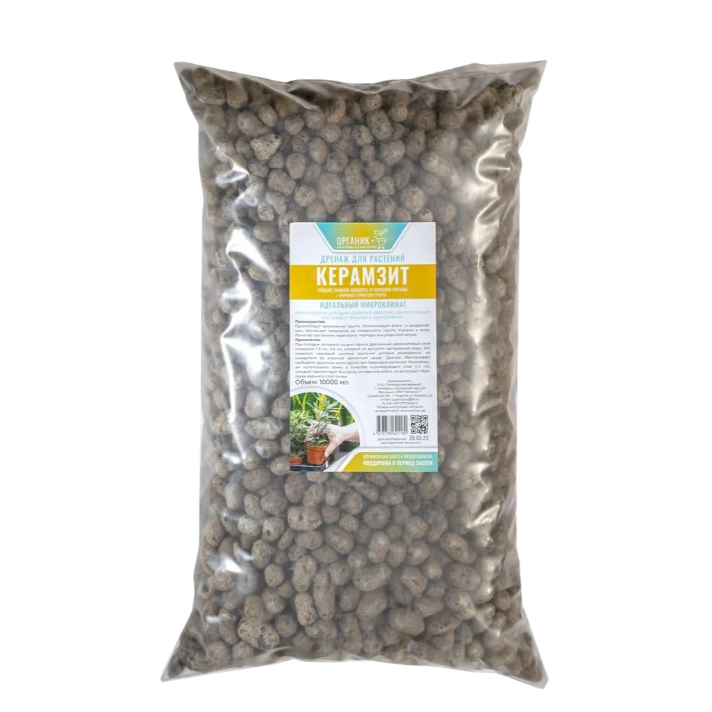 Дренаж цветочный Органик+ для растений, керамзит, идеальный микроклимат, 10 л предназначен для засыпания на дно горшка или балконного ящика. Способствует отведению излишков влаги от корней растений. Улучшает структуру грунта. Помогает оптимизировать процесс испарения влаги с поверхности почвы, создавая идеальный микроклимат. Керамзит не содержит вредных и токсичных веществ, обладает высокими водопоглощающими свойствами, отлично пропускает воздух и фильтрует почвенную влагу.
