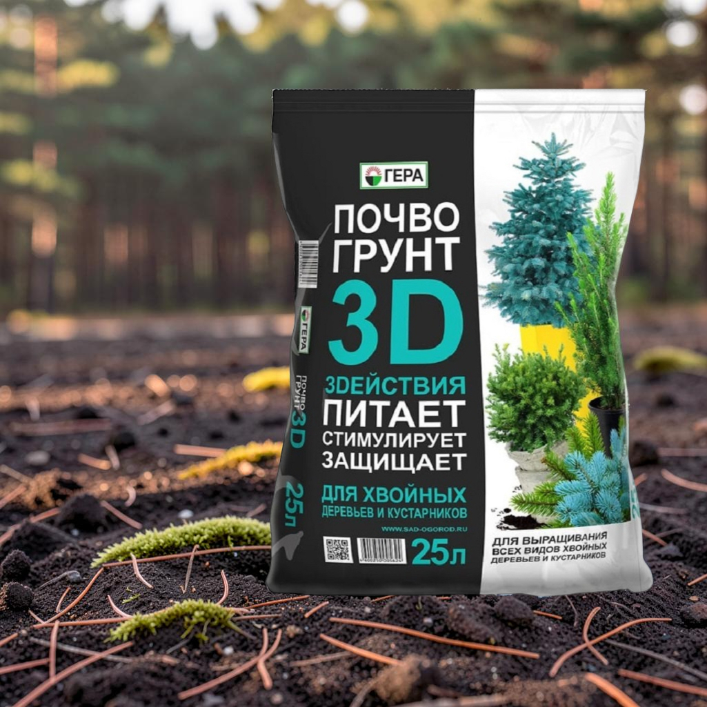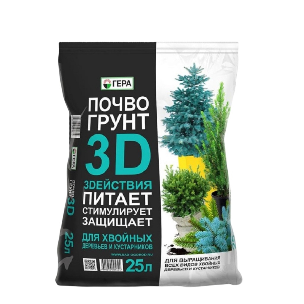 Почвогрунт Гера 3D, 3 действия, для Хвойных деревьев и кустарников, 25 л - это полностью готовый к применению грунт для выращивания и подкормки вечнозеленых хвойных деревьев и кустарников, таких как можжевельник, туя, кедр, ель, сосна, тис, лиственница, кипарис, кипарисовик, пихта, араукария, криптомерия, микробиота, и других вечнозеленых декоративных культур в открытом грунте и в домашних условиях (горшечное выращивание, в том числе культура бонсай)