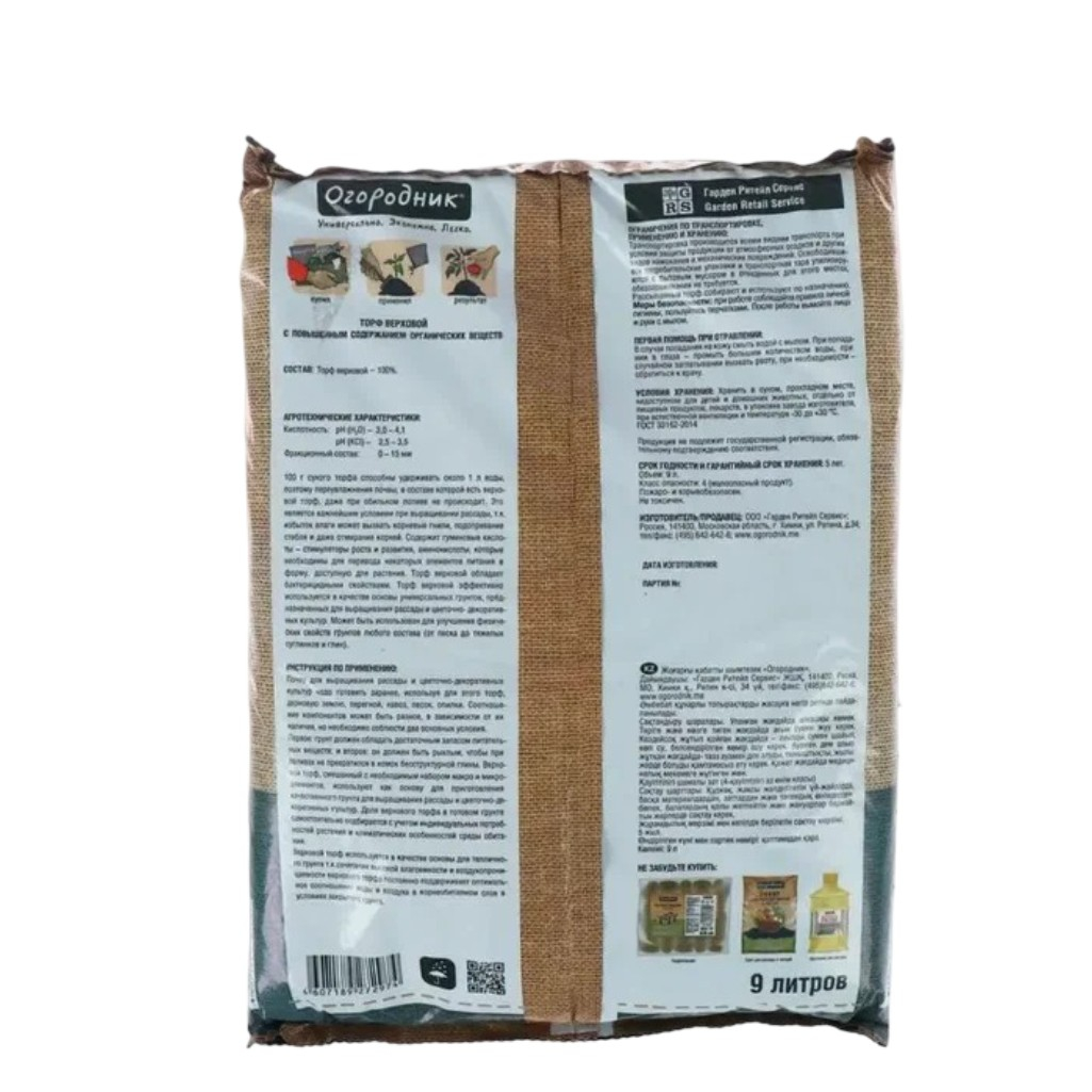 - Торф ОГОРОДНИК верховой 9л