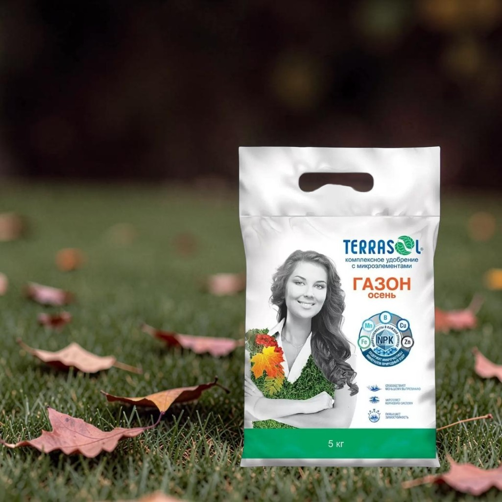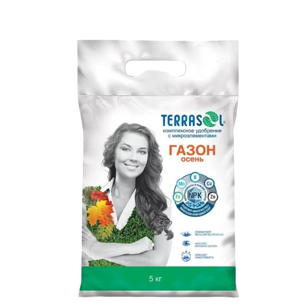 Удобрение TerraSol+ Газон Осень гранулированное, минеральное, комплексное с микроэлементами, 5 кг - это комплексное минеральное удобрение (тукосмесь) с микроэлементами в биокапсулах для осенней закладки и подкормки всех видов газонов (универсальный, спортивный, теневыносливый, парковый, цветущий, партерный и др). Применяется в качестве основного при закладке газонов в августе-сентябре и для осенних подкормок вегетирующих газонов. Обеспечивает полноценное питание газона в осенний период, повышает устойчивость трав к неблагоприятным факторам внешней среды (повышает зимостойкость), укрепляет корневую систему газонных трав, что способствует лучшей перезимовке, препятствует выпреванию, обеспечивая высокую сохранность газона. Газон вырастает плотным, с ровным травостоем насыщенного цвета.