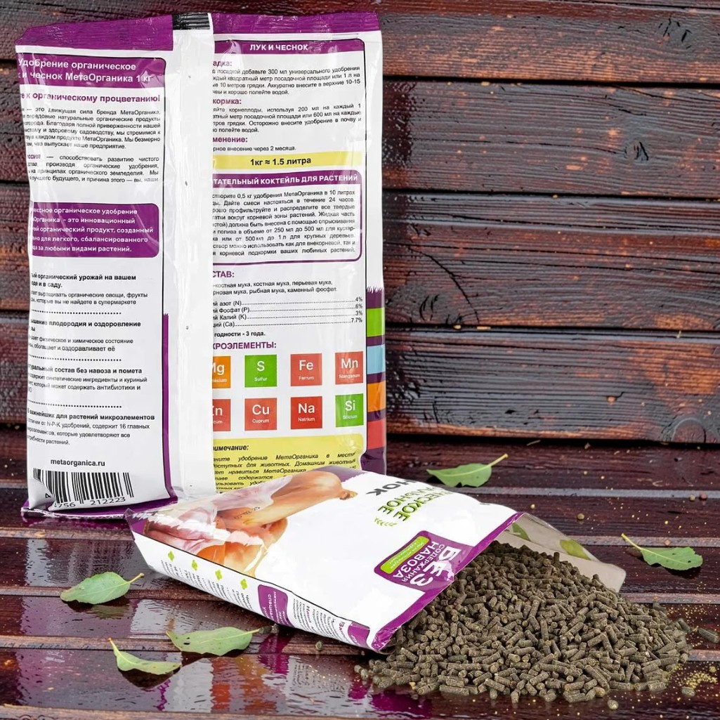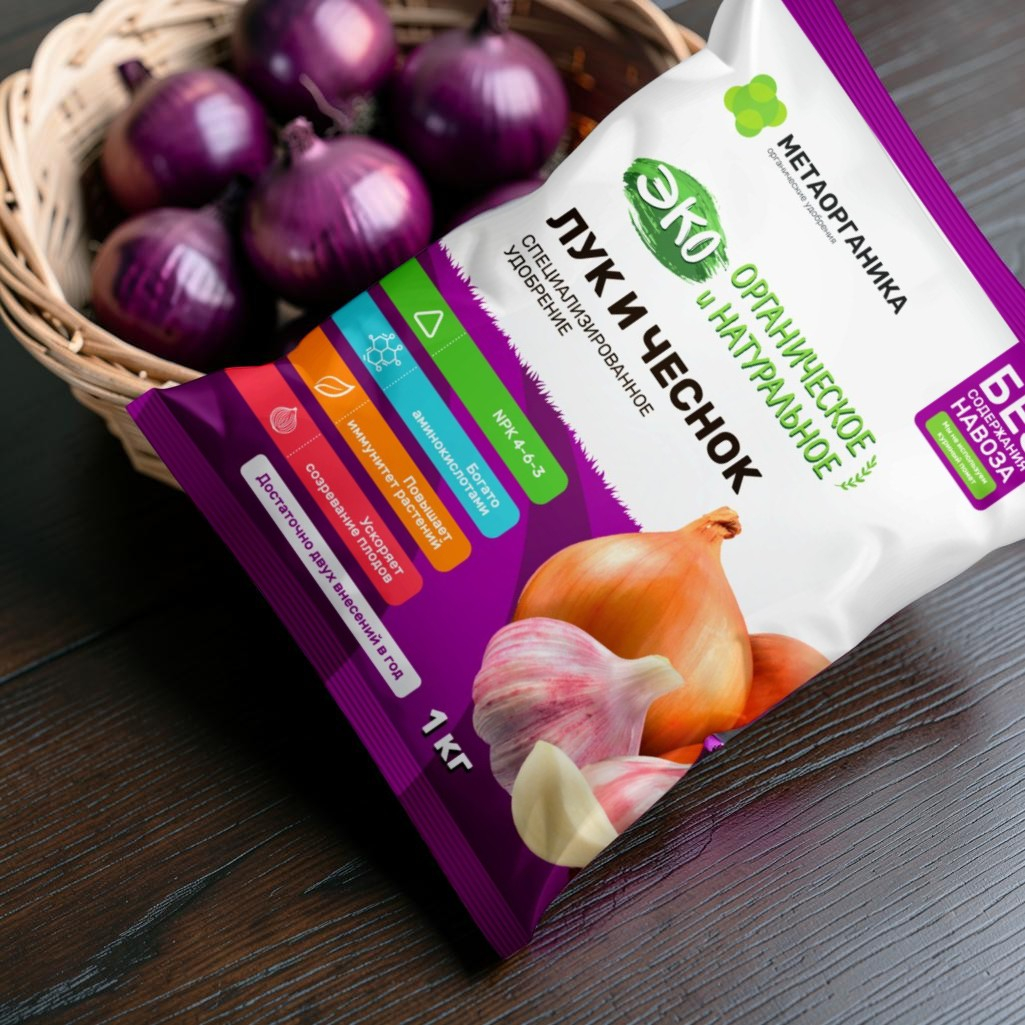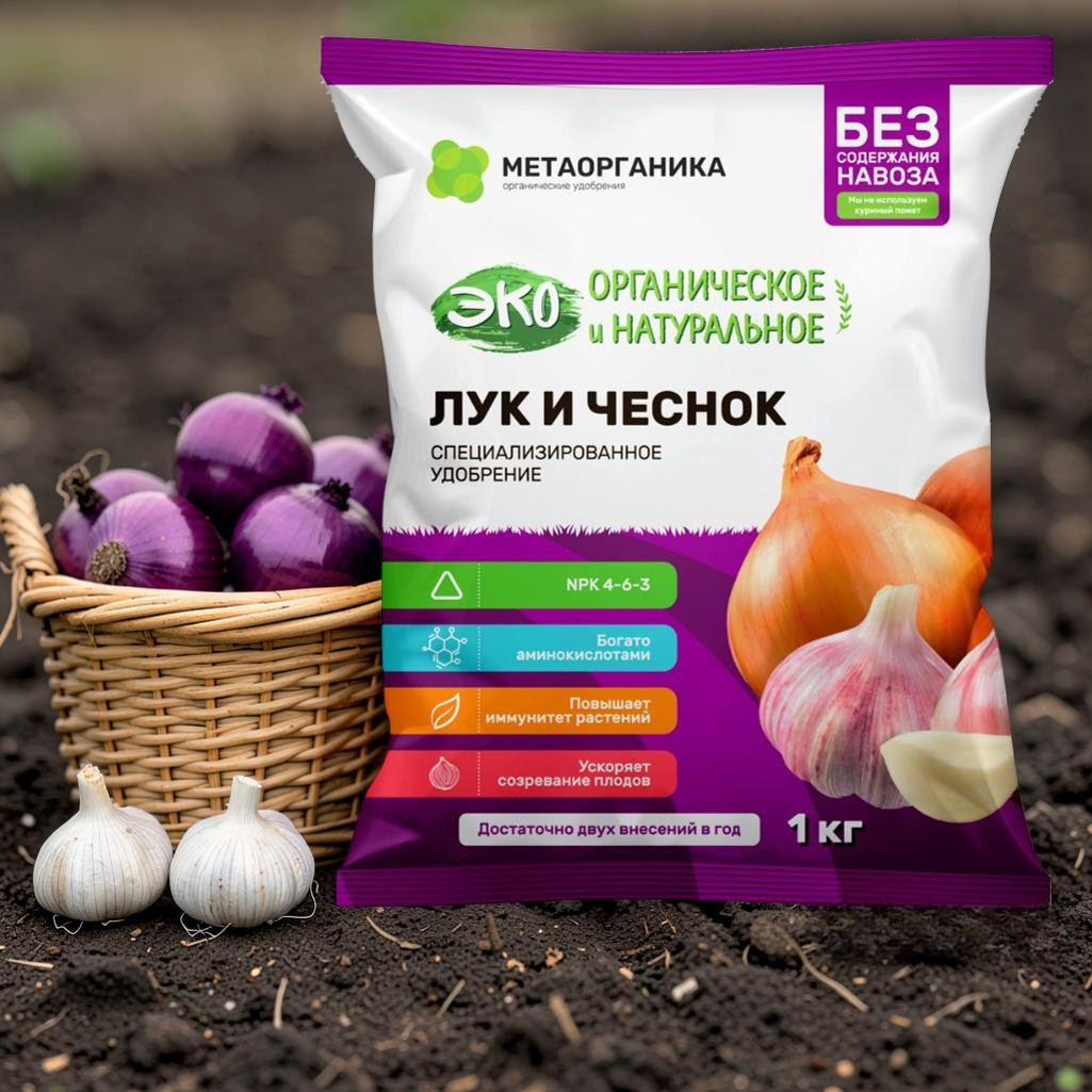 Удобрение органическое МетаОрганика Лук и чеснок, Эко, специализированное, 1 кг - это уникальное удобрение для луковичных растений, которое обогащает почву всеми необходимыми питательными веществами. Продукт создан на основе натуральных ингредиентов, что гарантирует его экологичность и безопасность для почвы, растений и окружающей среды. Он прекрасно подходит для культивирования лука, чеснока и других луковичных культур, стимулируя их активный рост, формирование крупных луковиц и повышение урожайности.