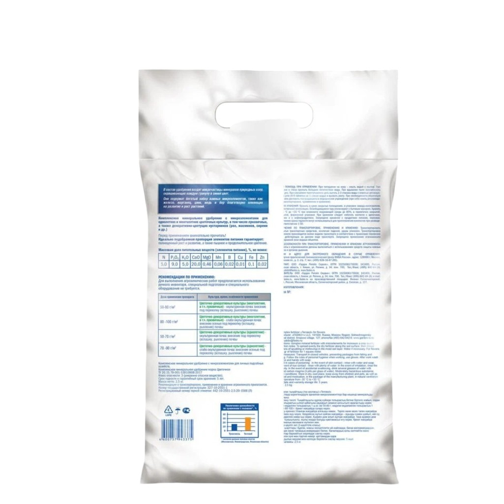Удобрение TerraSol Цветы универсальное, комплексное, смикроэлементами, 2.5 кг - это смешанное минеральное удобрение (тукосмесь) с микроэлементами для однолетних и многолетних цветочных культур, в том числе луковичных, а также декоративно-цветущих кустарников (роз, жасминов, сирени и др). Применяется в качестве основного при подготовке почвы, для местного внесения в лунки при посадке и для подкормок. Идеально подобранная пропорция элементов питания гарантирует полноценного роста и развитие, а также пышное и продолжительное цветение.