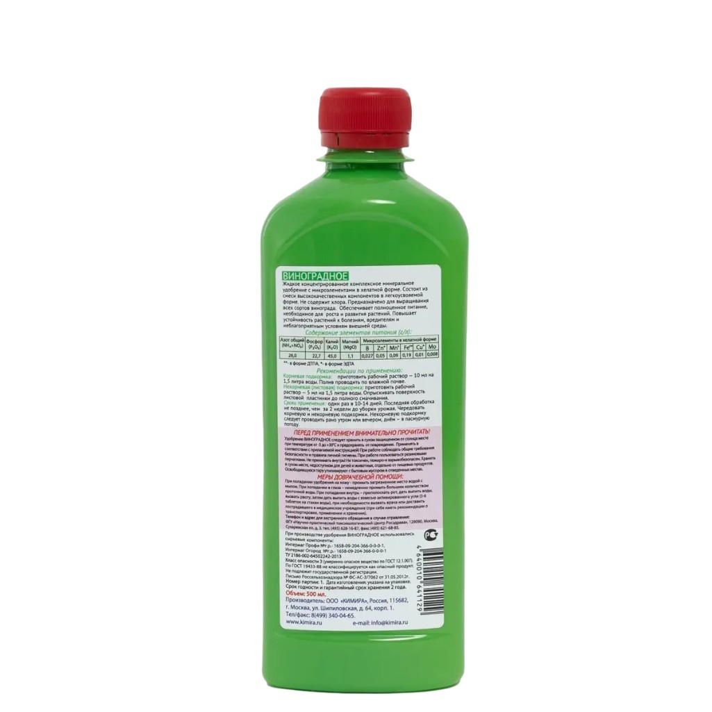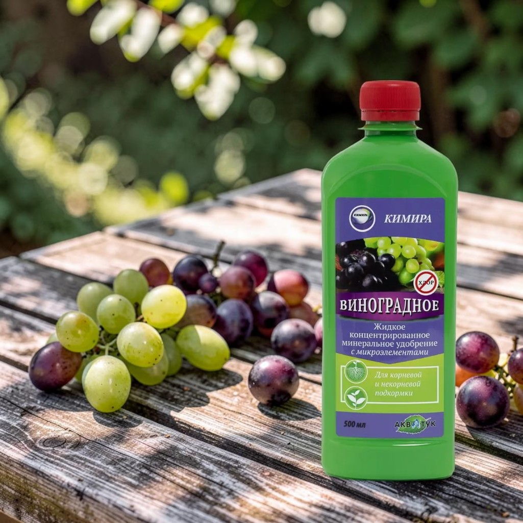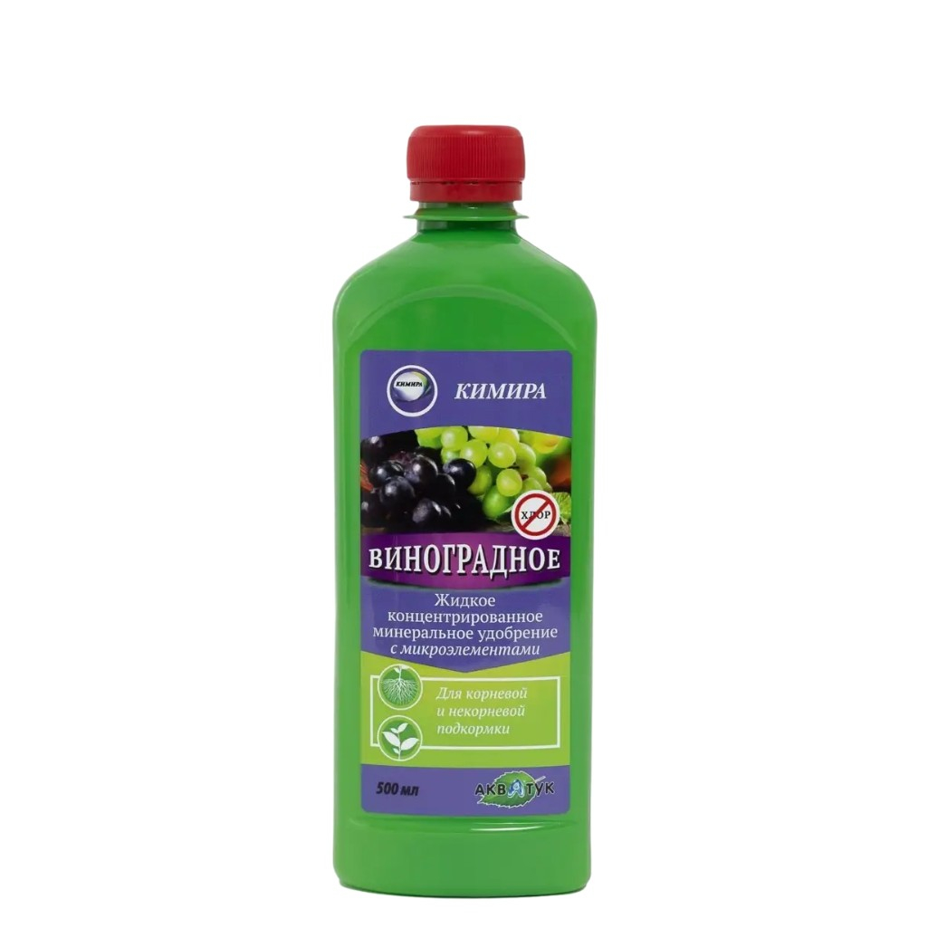 Удобрение Кимира Виноградное жидкое, минеральное с микроэлементами, концентрат, 500 мл - это минеральное удобрение, обогащённое микроэлементами в хелатной форме, специально разработанное для подкормки винограда. Оно исключает содержание хлора, легко растворяется в воде и предоставляет растениям сбалансированное питание. Применение этого удобрения способствует активному росту и развитию растений, укрепляет их иммунитет, повышает устойчивость к болезням, вредителям и негативным внешним факторам. Удобрение не способствует накоплению нитратов в плодах. Подходит для внекорневой и корневой подкормки всех сортов винограда.