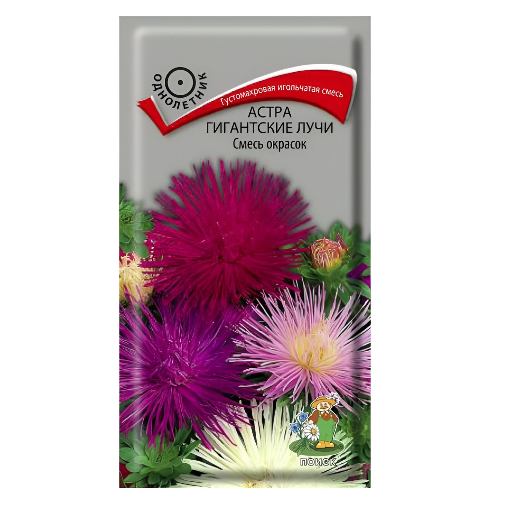 Семена цветов Астра Гигантские лучи смесь окрасок, Поиск, однолетник, 0,3 г — это сорт однолетней астры с крупными густомахровыми соцветиями игольчатого типа. Растения высотой около 60 см, обильно цветут в конце лета и подходят как для оформления цветников, так и для срезки.