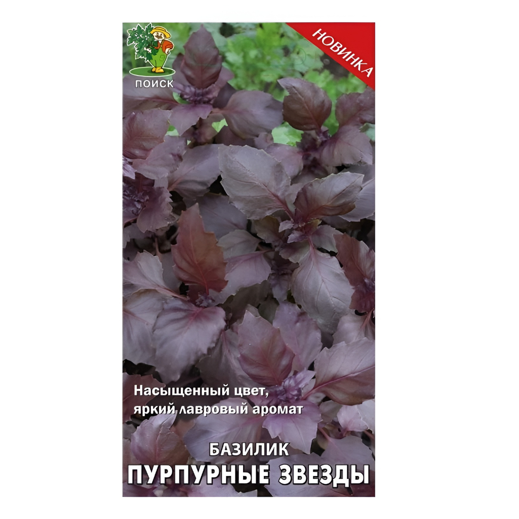 Семена базилик овощной Пурпурные Звезды, среднеспелый, Поиск, 0.1 г — среднеспелый сорт с насыщенной темно-фиолетовой окраской листьев и ярким лавровым ароматом. Период от всходов до начала хозяйственной годности составляет 45-50 дней. Растение прямостоячее, высотой 30-40 см, масса одного растения достигает 260 г.