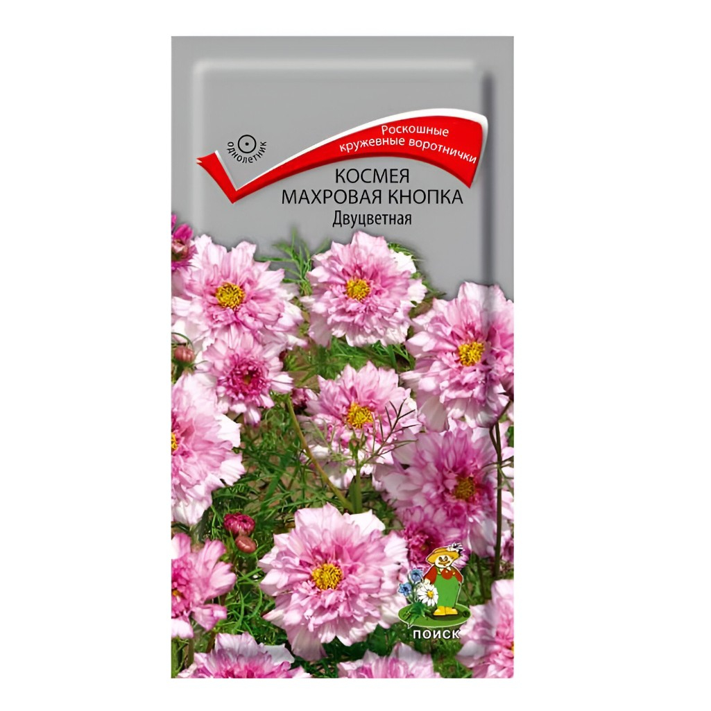 Семена Космея махровая кнопка двуцветная, однолетняя, Поиск, 0.1 г — это декоративное растение с ажурной листвой и крупными махровыми соцветиями нежной розово-белой окраски. Благодаря высокому росту и обильному цветению идеально подходит для создания цветников, массивов и срезки.