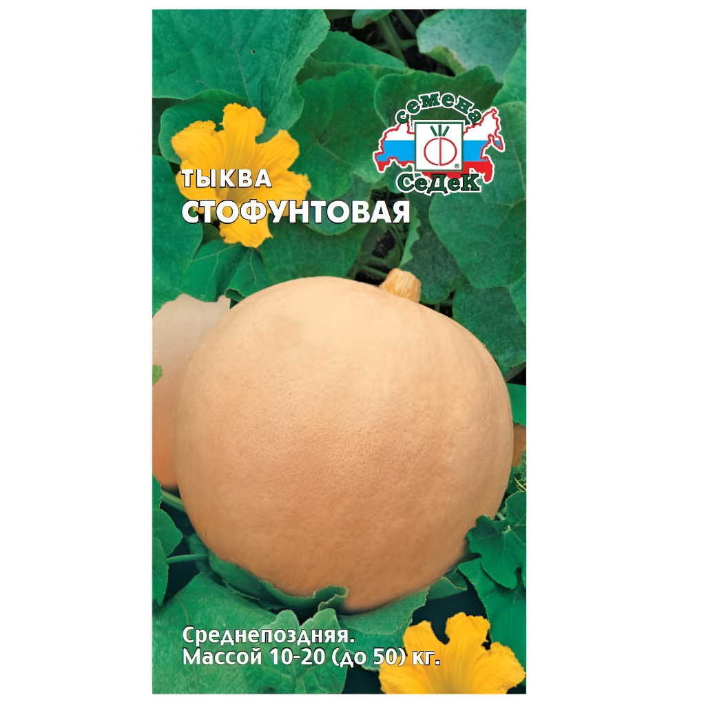 Семена Тыква Стофунтовая, среднепоздняя, однолетняя, Седек, 212654 — среднепоздний сорт, известный своими гигантскими плодами и высокой урожайностью. Период от всходов до созревания составляет 112-138 дней. Растение длинноплетистое, длина главного стебля достигает 7 метров. Плоды шаровидные, гладкие, слабосегментированные, желто-оранжевые, с тонкой корой, массой от 10 до 20 кг (отдельные экземпляры до 50 кг). Мякоть кремово-желтая, рыхлая, малосладкая.
